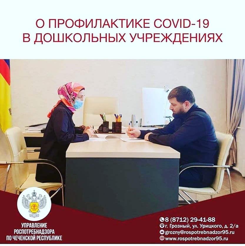 26.03.2021⠀Сегодня состоялась встреча руководителя Управления Роспотребнадзора по Чеченской Республике Риты Термулаевой с председателем Комитета Правительства ЧР по дошкольному образованию Асланбеком Джунаидовым @dzhunaidov_kpdo.⠀По итогам состоявшейся беседы принято решение усилить санитарно-просветительскую работу среди родительского сообщества, а также сотрудников детских дошкольных организаций по мерам против заноса и распространения новой коронавирусной инфекции в организованные детские коллективы.⠀Так, во всех детских дошкольных учреждениях республики организован входной фильтр: дети с малейшими признаками острой респираторной вирусной инфекцией не допускаются.⠀Также проводятся мероприятия по дезинфекции во всех детских дошкольных организациях республики с обработкой всех контактных поверхностей, проведением обеззараживания воздуха помещений.⠀Напомним, что соблюдение рекомендаций Роспотребнадзора продолжается в связи с сохраняющейся опасностью распространения COVID-19._____________________________Управление Роспотребнадзора по Чеченской Республике📲 горячая линия по COVID-19:8 (989) 916-72-348 (938) 989-07-58📍 ЧР, г. Грозный, ул. Урицкого, д. 2/а☎️/📠 8 (8712) 29-41-88✉️ grozny@rospotrebnadzor95.ru🌐 www.rospotrebnadzor95.ru